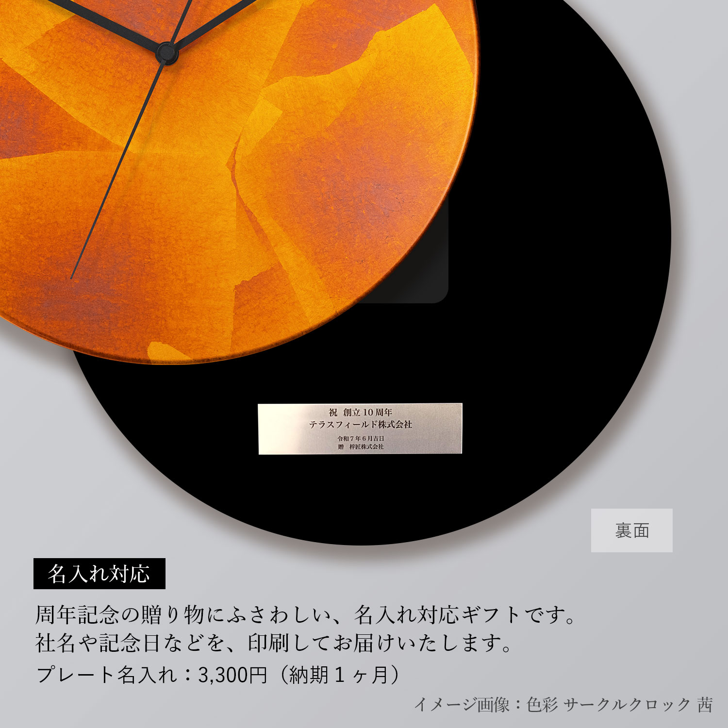 名前や社名、ロゴを入れることができます。 お祝い。お礼。記念品。 特別な贈り物にお名前や社名、ロゴをお入れすることができます。ご予算や納期、数量などのご要望に合わせて幅広い商品をご用意しております。お気軽にご相談ください。 《スクリーン印刷》企業さまの記念品など大部数向けです。 ・版代(金、黒、白、赤) 各11,000円(税込) ・印刷代 金 @440円(税込) 金以外 @110円(税込) ※画像は「色彩 サークルクロック 茜」の表面に名入れをしたものです。 ※名入れは時計の裏面に入れることもできます。 ご予算や納期、数量などのご要望に合わせて幅広い商品をご用意しております。 お気軽にご相談ください。 ◆お問い合わせはこちら
