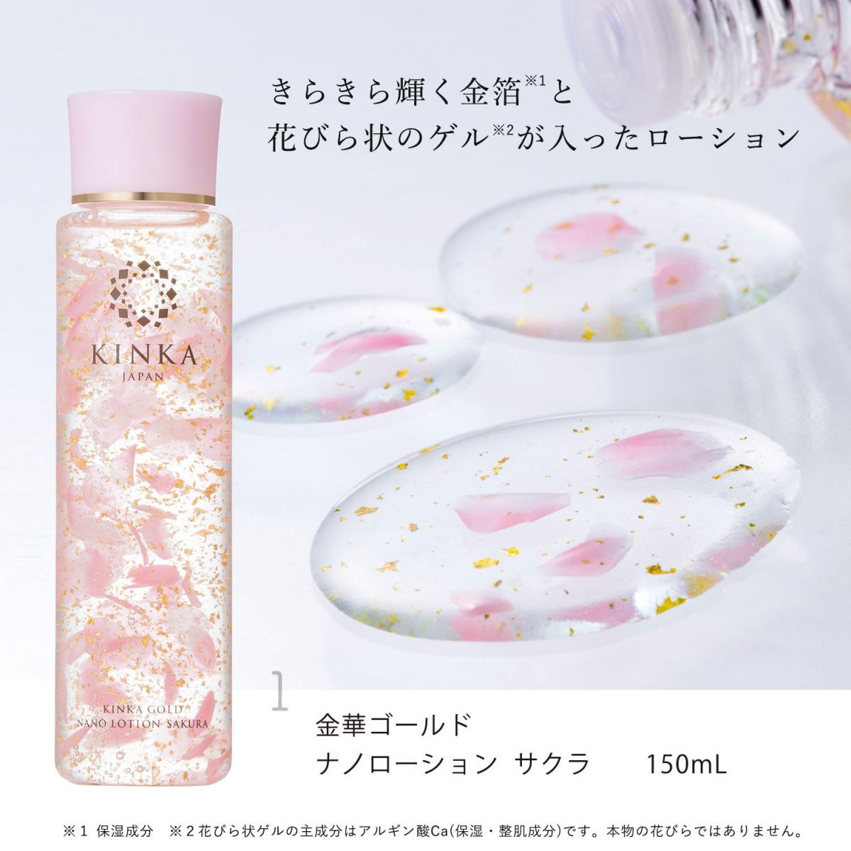 《金華ゴールド ナノローション サクラ》 水、BG 、グリセリン、プロパンジオール、金、ポリソルベート20、カルボマー 、EDTA-2Na、水酸化K、アルギン酸Ca、カンテン、ジェランガム、ヒアルロン酸Na、ソメイヨシノ葉エキス、水溶性プロテオグリカン、アロエベラ葉エキス、クズ根エキス、1,2-ヘキサンジオール、酸化チタン、PG、赤226、フェノキシエタノール、メチルパラベン、香料