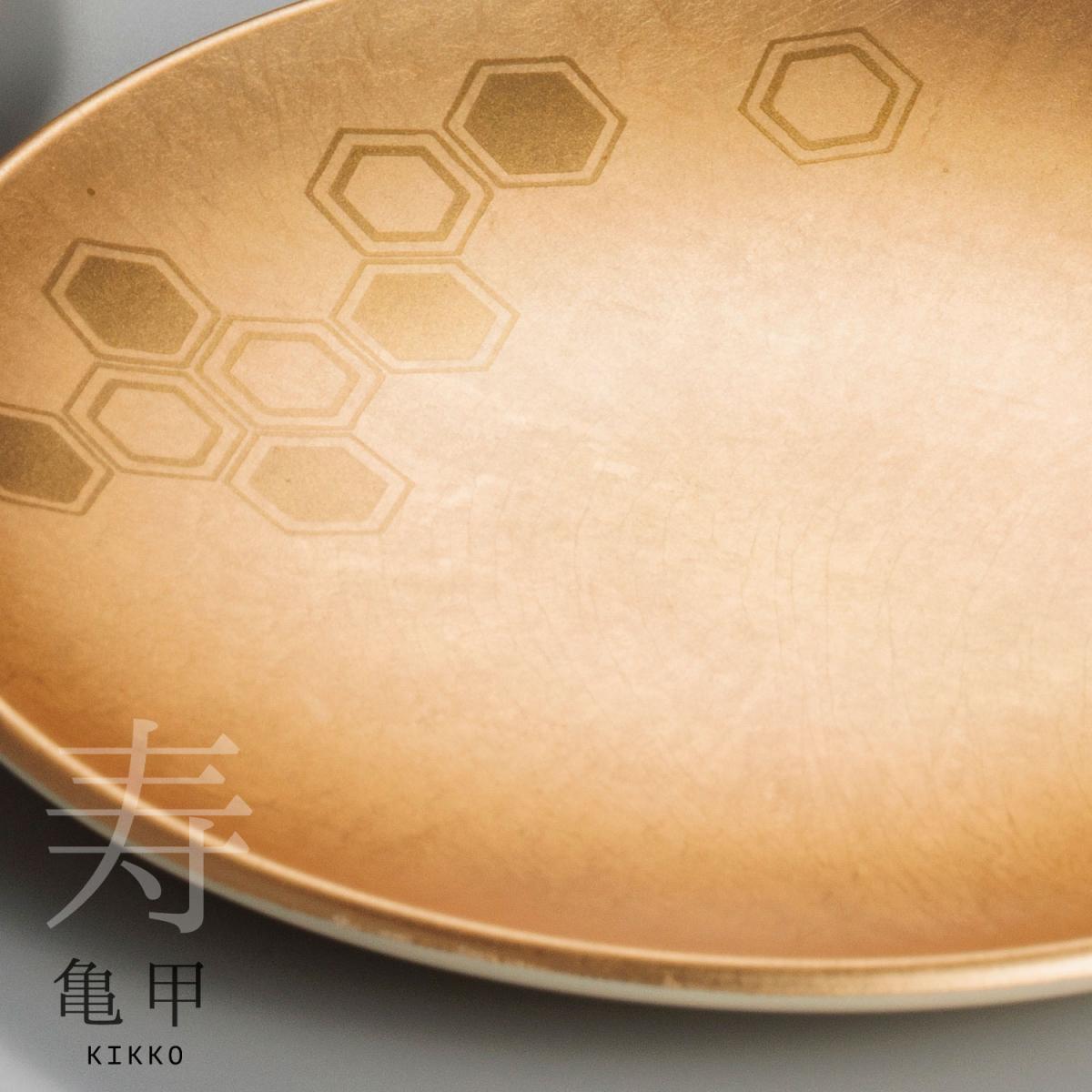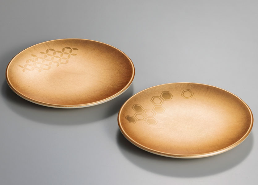 伝統工芸を日常の暮らしに 金沢箔の上に縁起の良い吉祥紋をあしらった、華やかな銘々皿のセットです。 箔一では、金沢箔の伝統を守りながら、これを日常生活で使えるように改善をかさねてきました。コーティングの技術を磨き、美しく耐久性の高い工芸品を提案しています。 食卓を明るく華やかに彩る伝統工芸の器を日常に手軽に取り入れることができます。