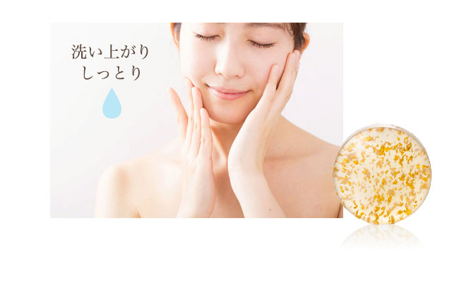 スクワラン、コラーゲンなど、うるおい成分配合の金箔入り洗顔石けんです。