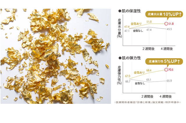 金箔*1のほか、保湿成分としてプラチナ、水溶性コラーゲン、スクワラン、ハトムギ種子エキスを配合。