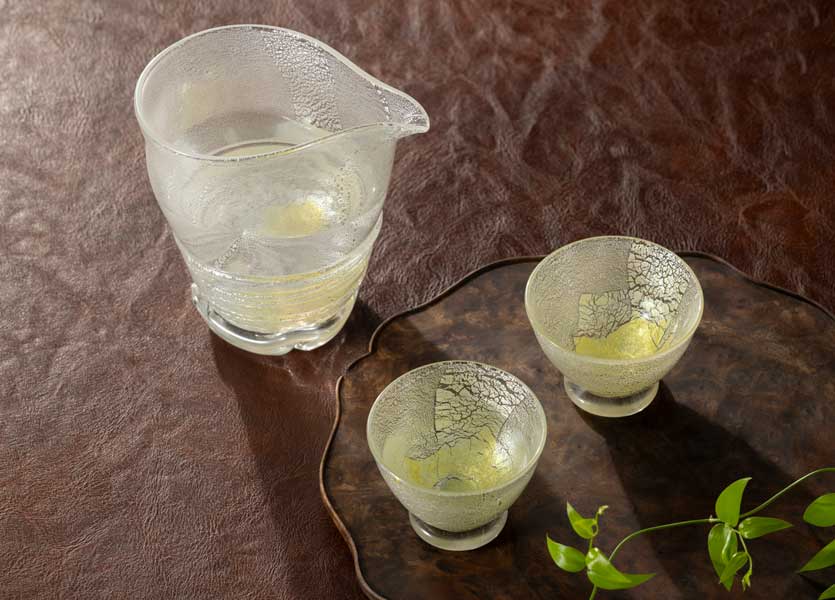 熟練の職人が一点ずつ丁寧に宙吹きで仕上げたガラス酒器に、銀澄を贅沢に施した、華やぎと気品の酒器セットです。