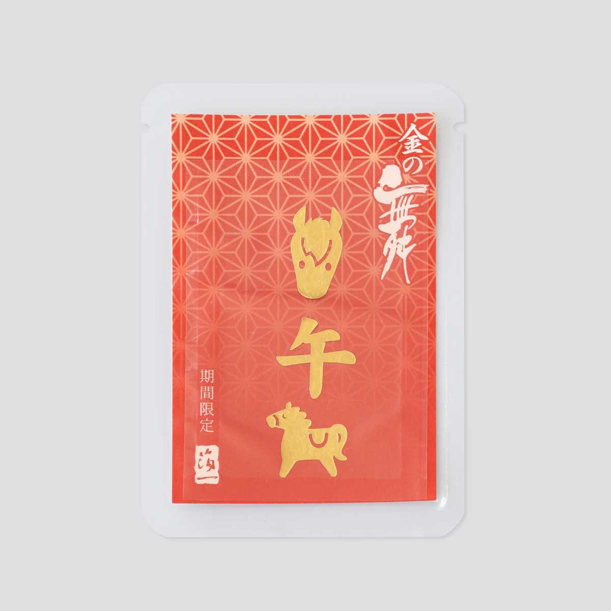 2026年の干支である「午」の文字と、馬を象った食用金箔3枚入りです。