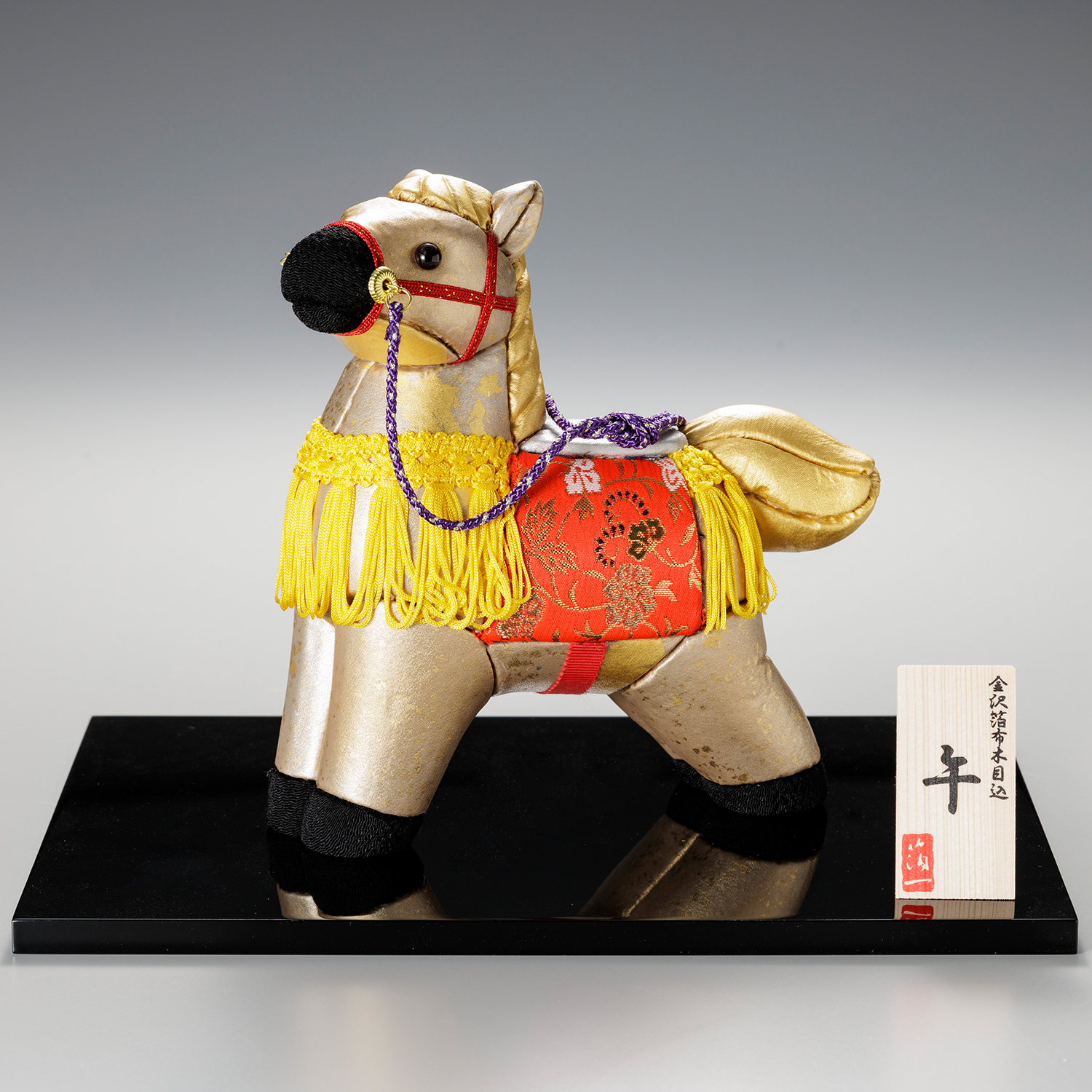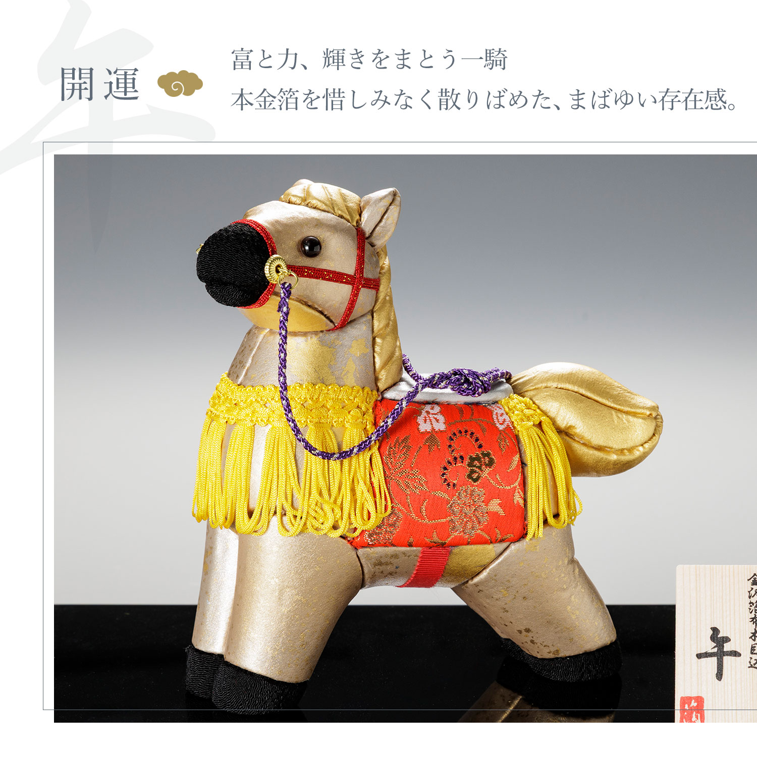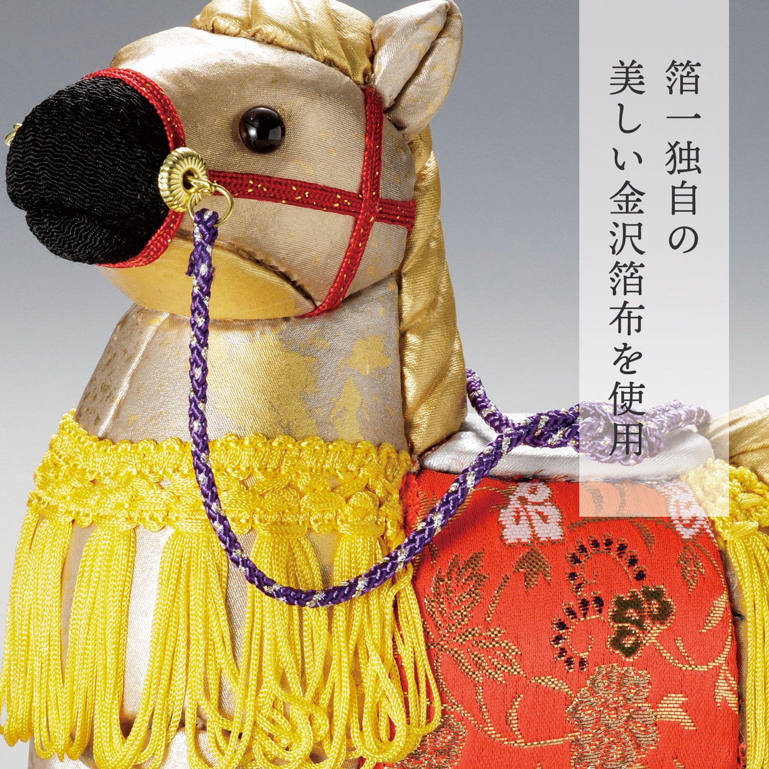 鞍には繁栄を願う「花唐草」の文様をあしらいました。運気の上昇を願って仕立てられた、縁起物の王者です。