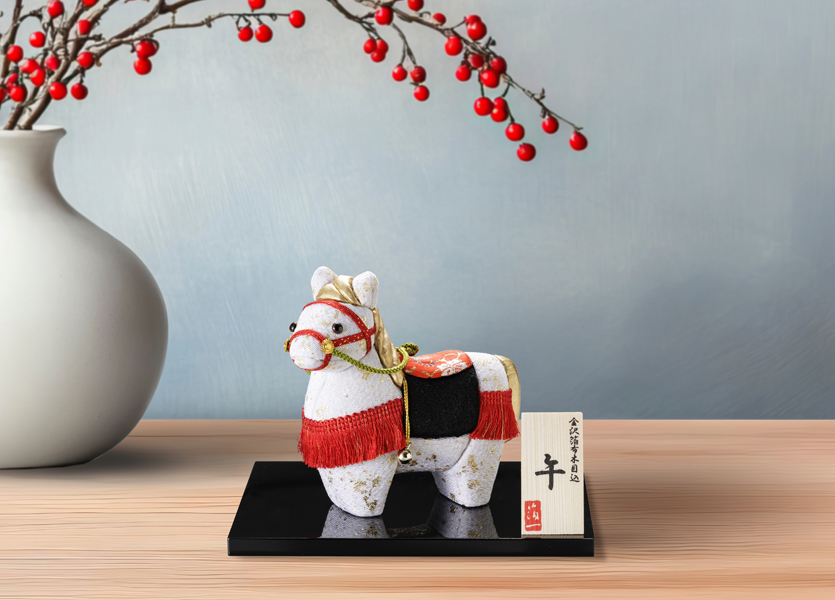 テーマは「風」と「繁栄」。風のように勢いよく駆け、実りを呼び込む一年に。前進と成長の象徴として、午が希望を導きます。
