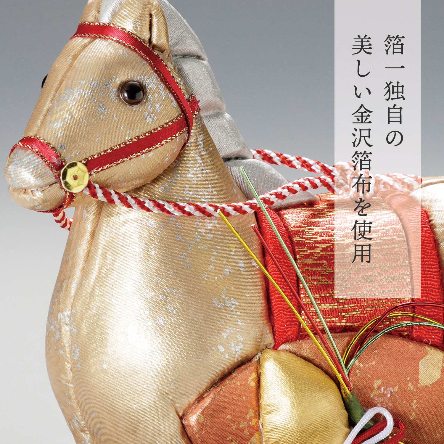 箔一ではこの木目込人形に、研究の末の生み出した「箔布」を木目込んでいます。布に貼られた箔は優雅に煌き、尚且つ耐久性を持たせています。