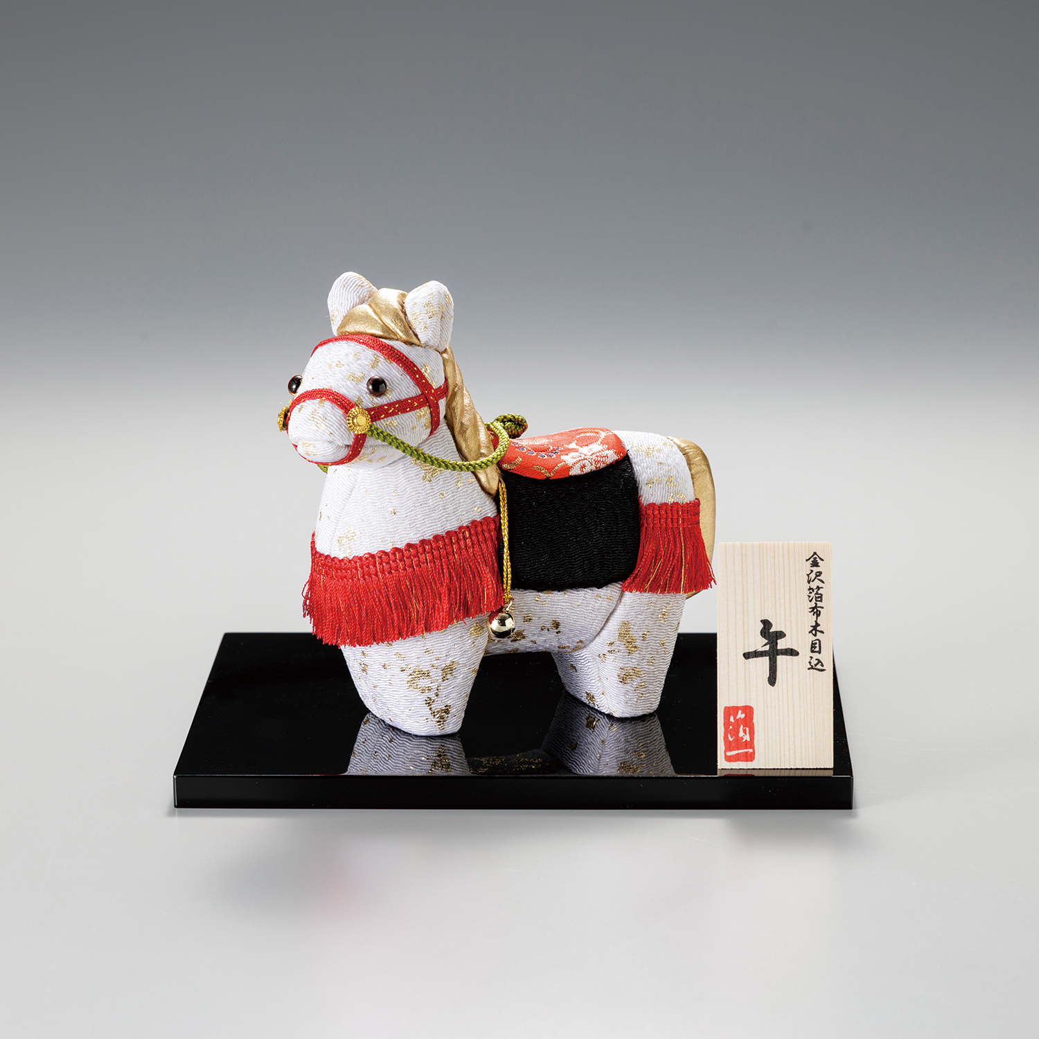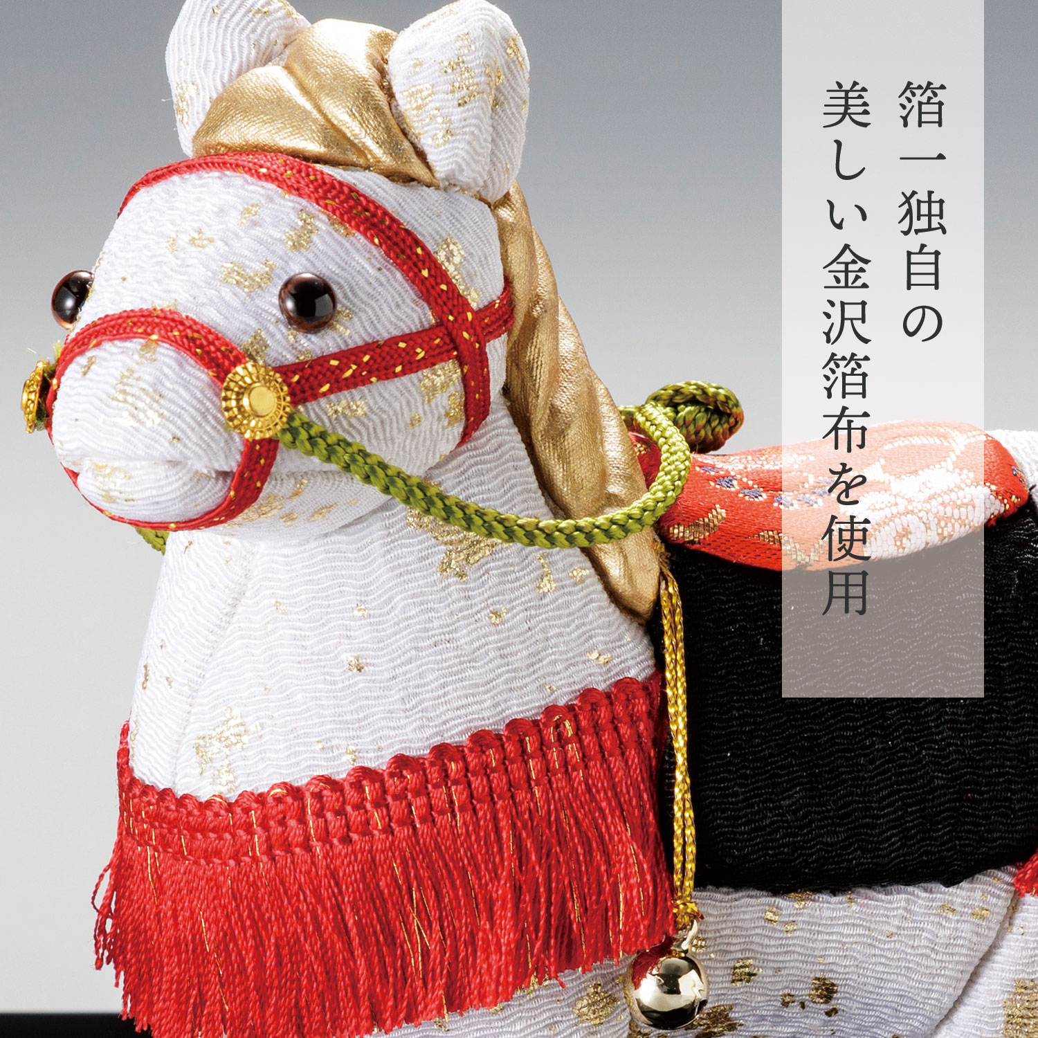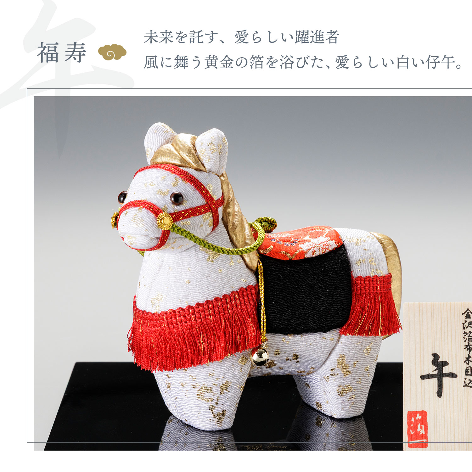 生まれてすぐに立ち上がる仔午は、「独り立ち」や「成功」の象徴とされます。頼もしく可愛く、飾るご家庭を見守ってくれることでしょう。鞍にあしらった「花唐草」の文様には、「発展」や「繁栄」への願いを込めました。