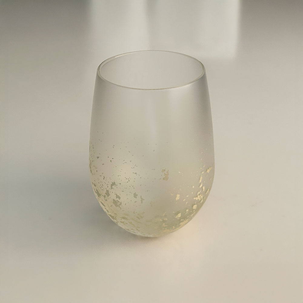 箔一の定番となりつつあるStardustシリーズより、白いガラスの肌に、箔の美しさを際立たせ、箔一独自の技で、箔と皮膜の干渉により、まるで光を内包し、キャンドルの炎がゆらめいているかのような箔の輝きが飲み物を輝かせ、グラスを囲む大切な方々の時間を、静かに美しく輝かせます。