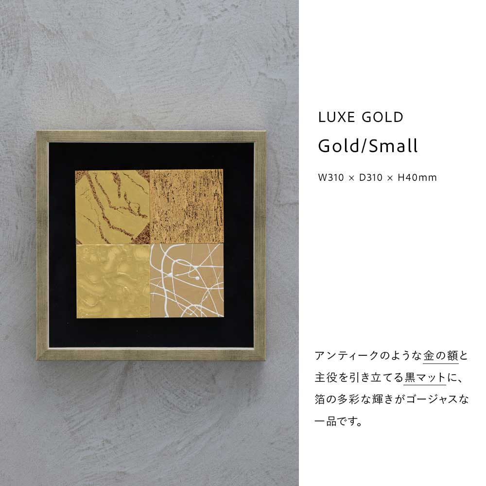 LUXE GOLDの紹介 テクスチャーを動画でチェック 写真では伝わらない箔の輝き方、テクスチャーを動画にてご覧ください。(※光の当たり方や時間帯、照明により表情は異なります。) 額装した金箔の装飾のアートは、絵画の風合いとはまた一線を画す独特の世界観を表現しています。 家族がよく過ごすリビングや、お客様がよく目にするエントランスなど、お好みの場所に飾ってお楽しみください。 ※動画は「LUXE GOLD (Gold/Large)」です。