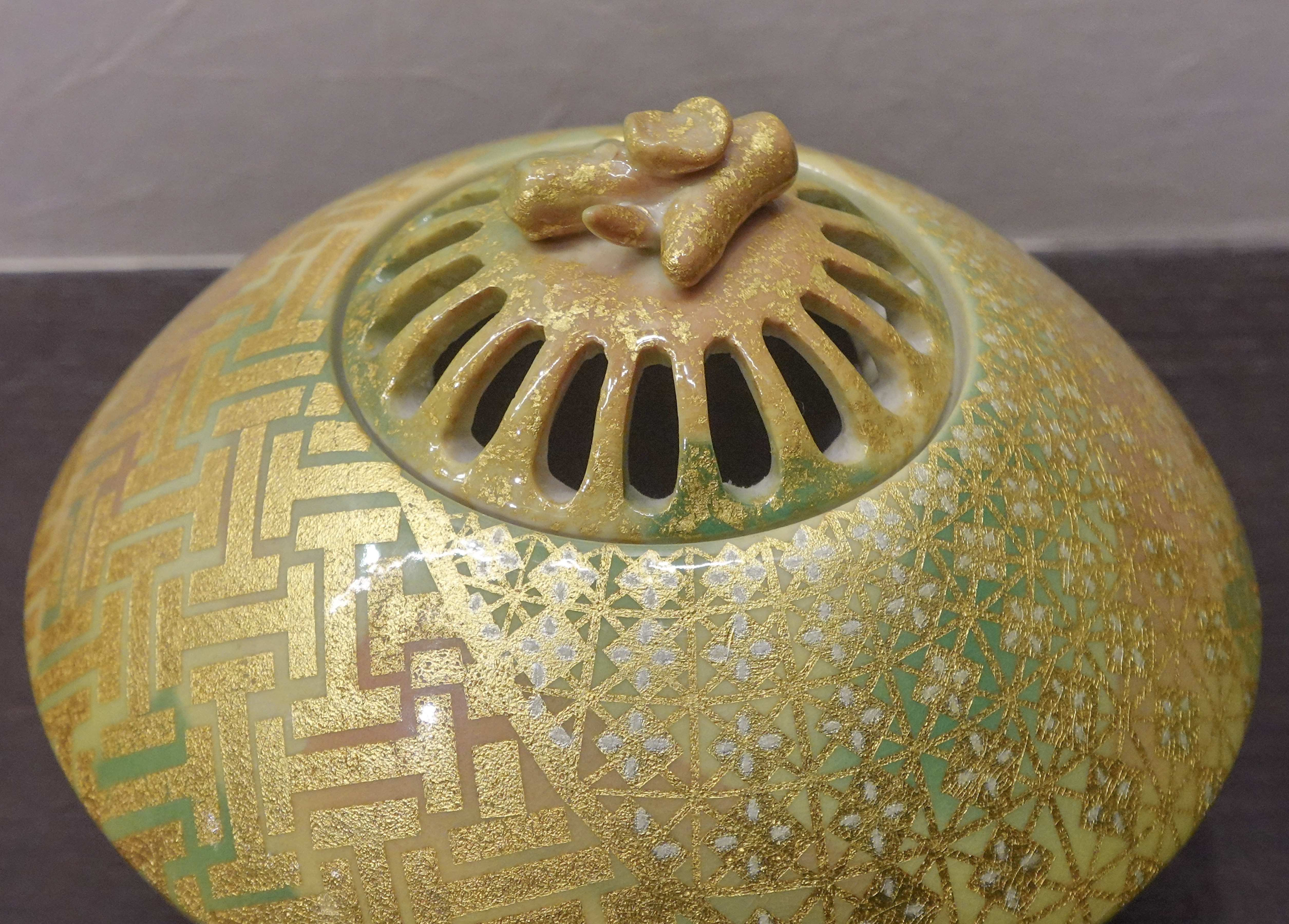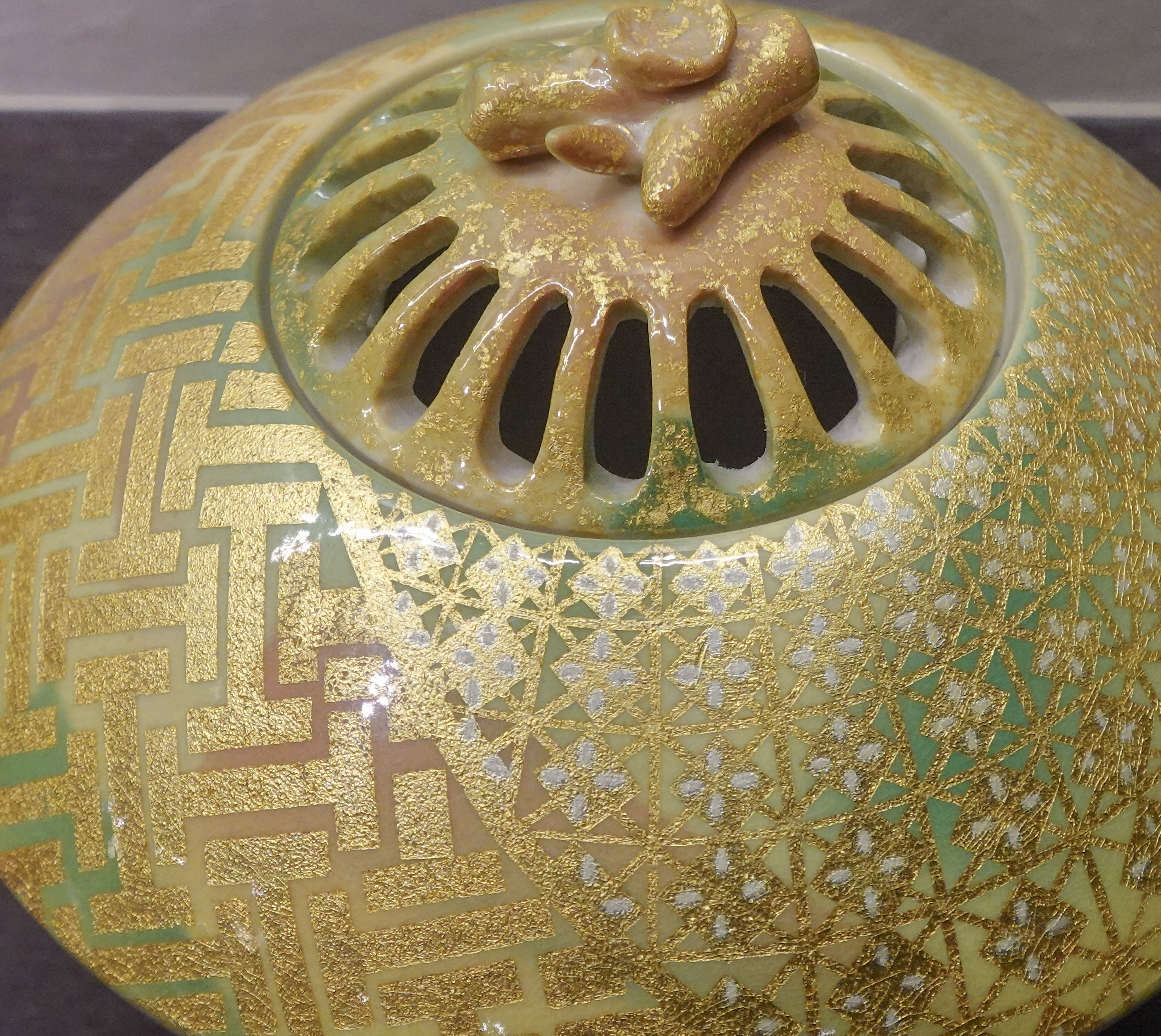 九谷焼の歴史では、花鳥風月をモチーフにした絵柄が多く好まれてきました。山田登陽志さんは、そうした流れの中で抽象的なモチーフと素材そのものの美を表現する作家です。金箔を美しくあしらったパターン柄。背景の緑から黄色へのグラデーションが箔の美をいっそう演出します。金箔の上から釉薬をかけて焼き付けしていますが、箔の微妙なしわ感や華やかな色彩を見事に表現しています。その正確無比の技は、超絶技巧とたたえられています。