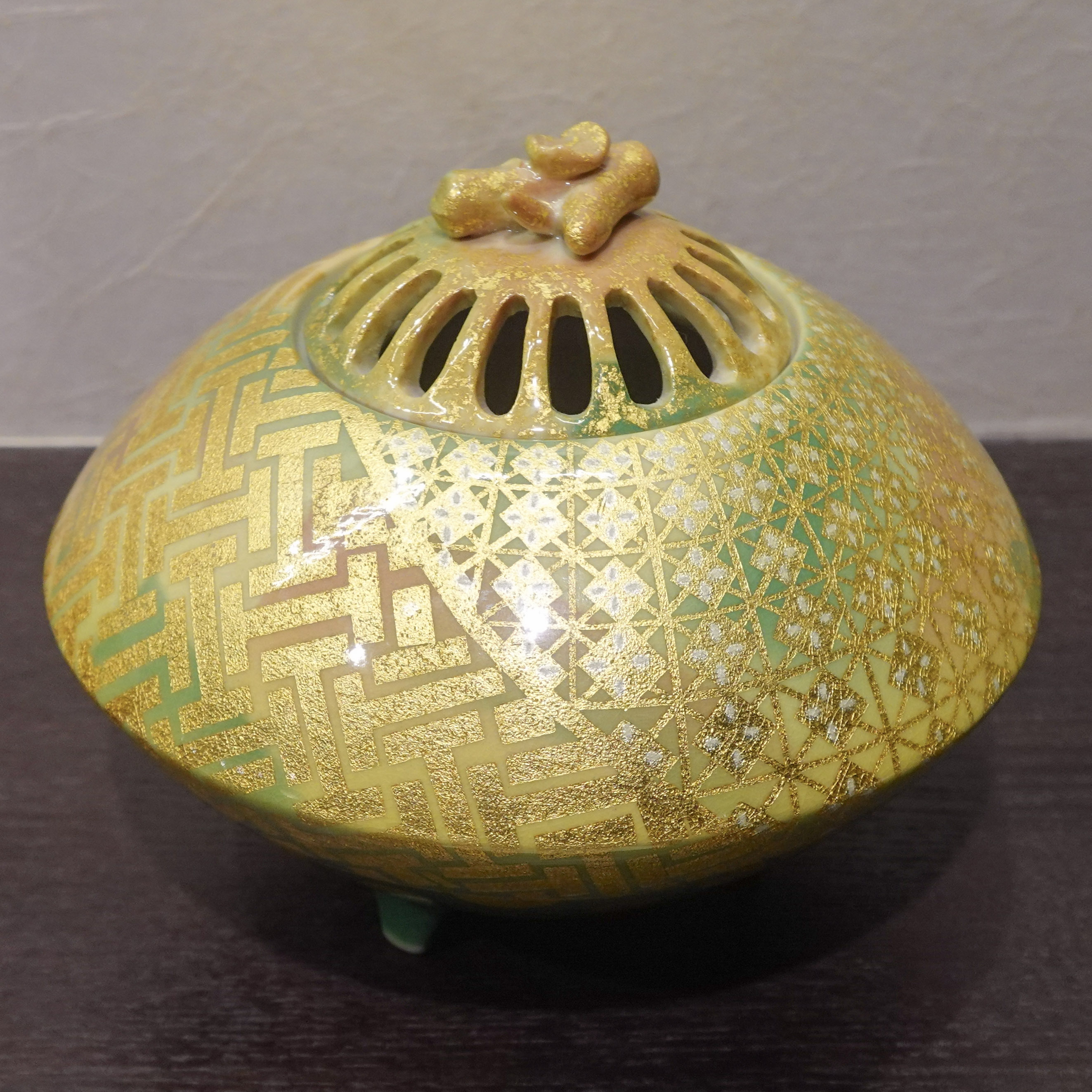 「香炉 ソロバン型(金箔ロマン)」は、日本の伝統工芸である 金沢箔の美 を陶磁器の造形に閉じ込めた香炉です。九谷焼の器面に金箔を緻密にあしらい、まるで宝石のように輝く表情を作り上げています。金箔の光と、背景の緑から黄色へのグラデーションは美しく調和し、日々の空間に上質なアクセントをもたらします。