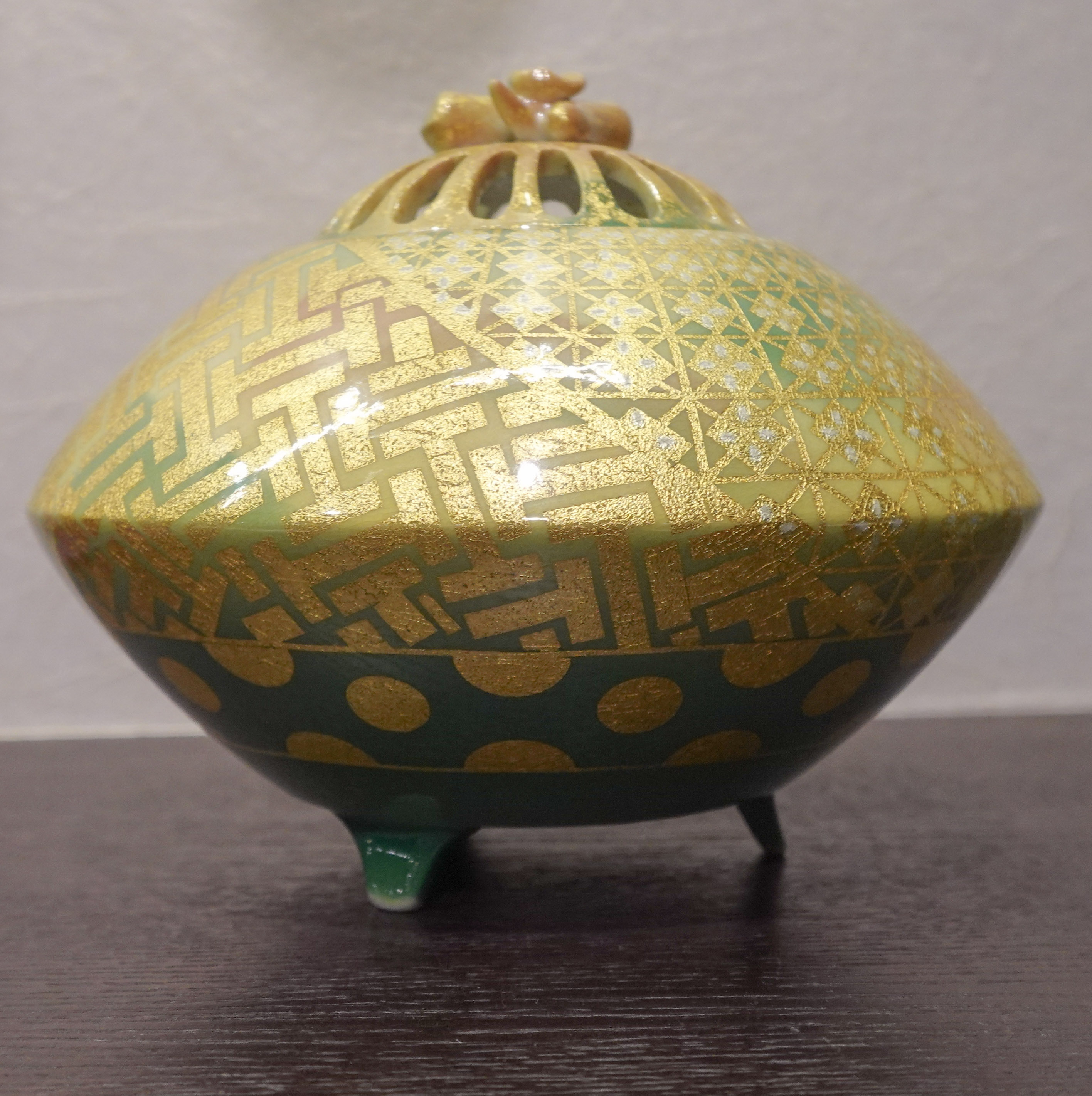 ソロバン型という独特のフォルムは、香炉としての安定性を保ちながら、視覚的なバランスにも優れています。日常の香りを楽しむツールとしてだけでなく、インテリアとしての存在感も抜群です。玄関やリビング、書斎など、落ち着いた空間に置くことで、金箔の輝きと陶磁器の質感が静かなアクセントとなり、香りのある生活をより豊かにしてくれます。