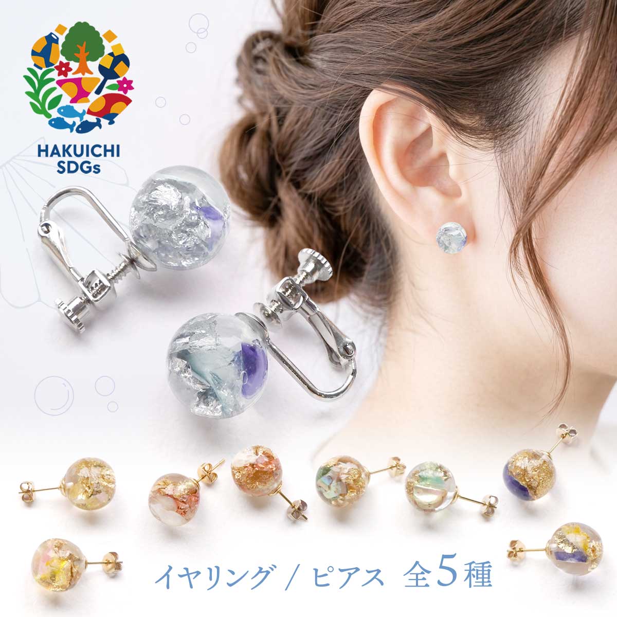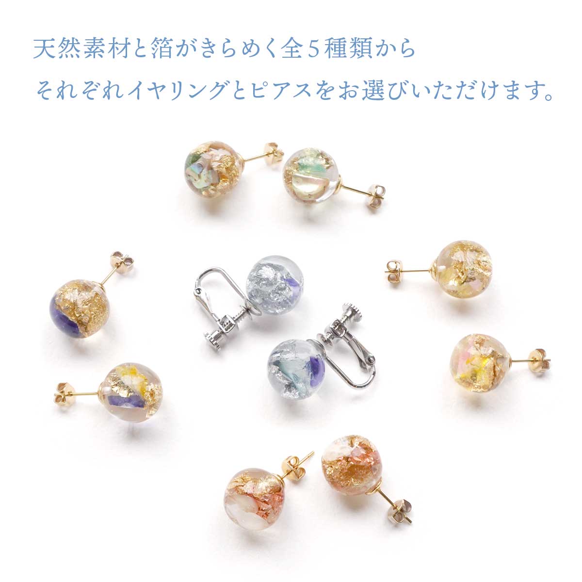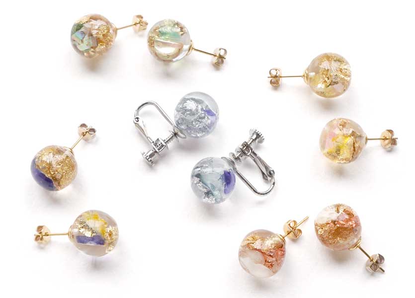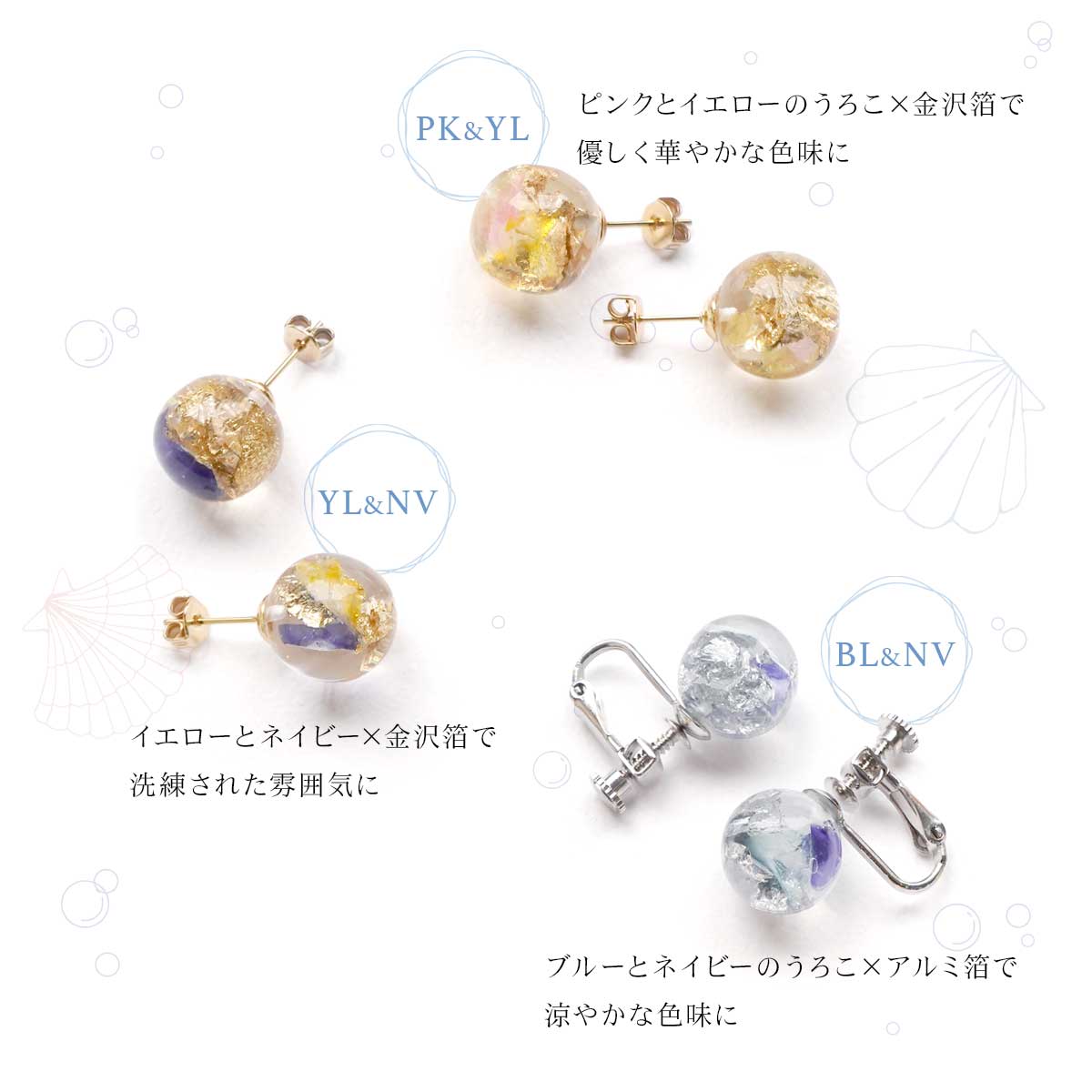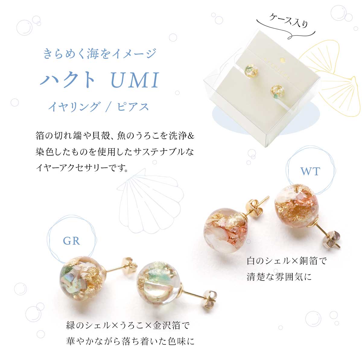 天然素材と箔と樹脂を用いたファッション雑貨シリーズ「ハクト」の、 きらめく海をイメージしたUMIシリーズ。