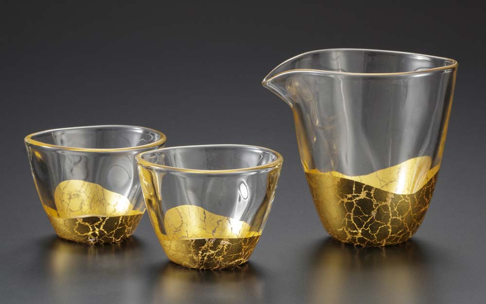 そんな時間をさらに豊かにしてくれるのが、〈水月シリーズ〉の酒器。 水面に映る月をすくい取ったような金箔の揺らぎが、お酒の色や光を美しく映し出します。 薄造りの口あたりは、冷酒の澄んだキレや燗酒のまろやかさを一層引き立て、手にするだけで贅沢な気分に。