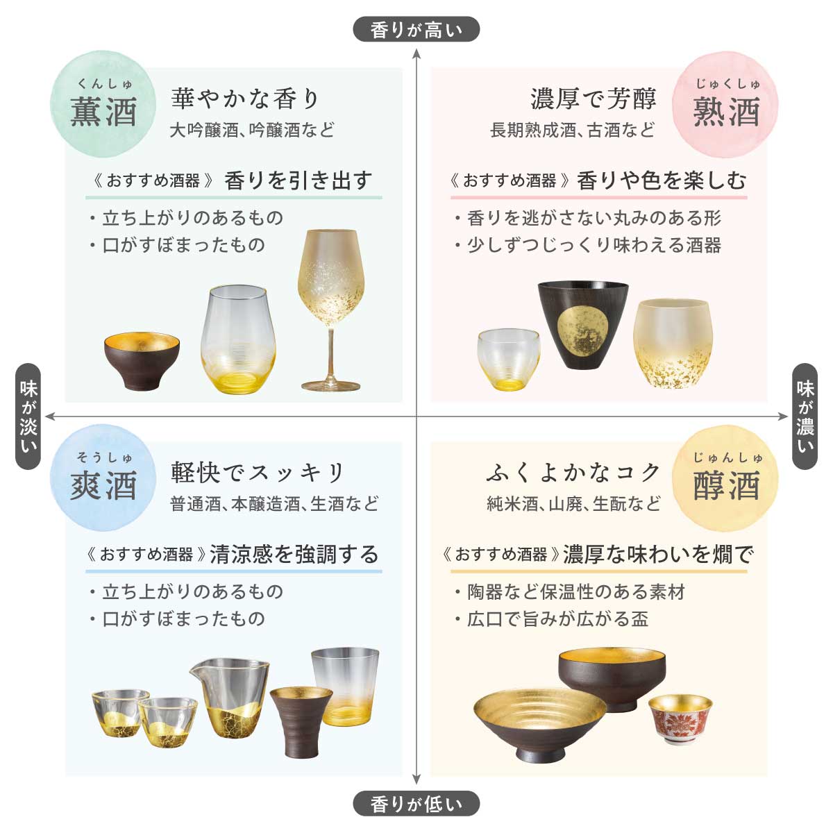 今回は、唎酒師(日本酒ソムリエ)として活躍する、多々見まみのさんの監修のもと、日本酒を4つのタイプに分類し、それぞれにふさわしい日本酒の魅力をより一層引き立てる箔一のおすすめ商品もあわせてご提案いたします。