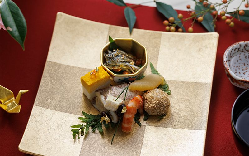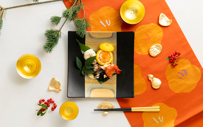 たくさん作らなくても、人数分のおせちを少しずつ盛りつけるだけで、 金沢箔の器が特別感のあるお正月のテーブルを演出します。