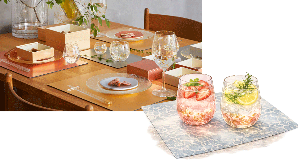 控えめにきらめく箔の表情が、和の器にも洋の食器にも自然に調和します。