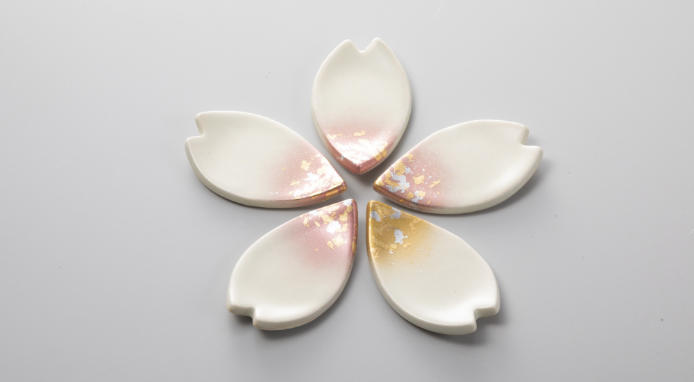 花びら型の陶器(美濃焼)に、箔加飾を上品にあしらった箸置きです。5枚を並べると桜の花の形になります。一見控えめにも見える箔加飾は、箸と一緒に配膳すると際立ちます。